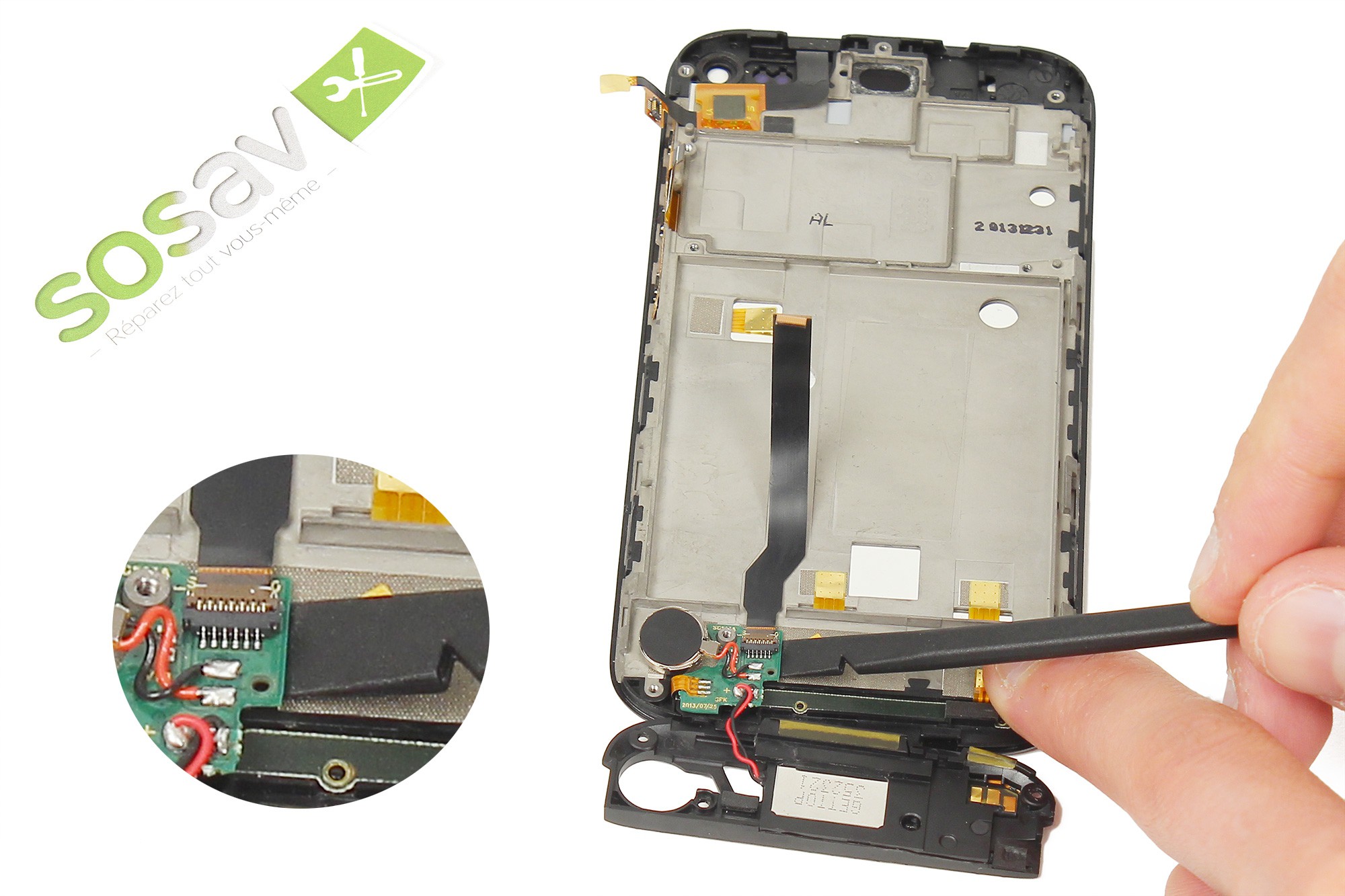 Réutilisez la spatule en nylon pour décoller le vibreur sans le retirer totalement, celui-ci étant lié à la carte via deux fils soudés.