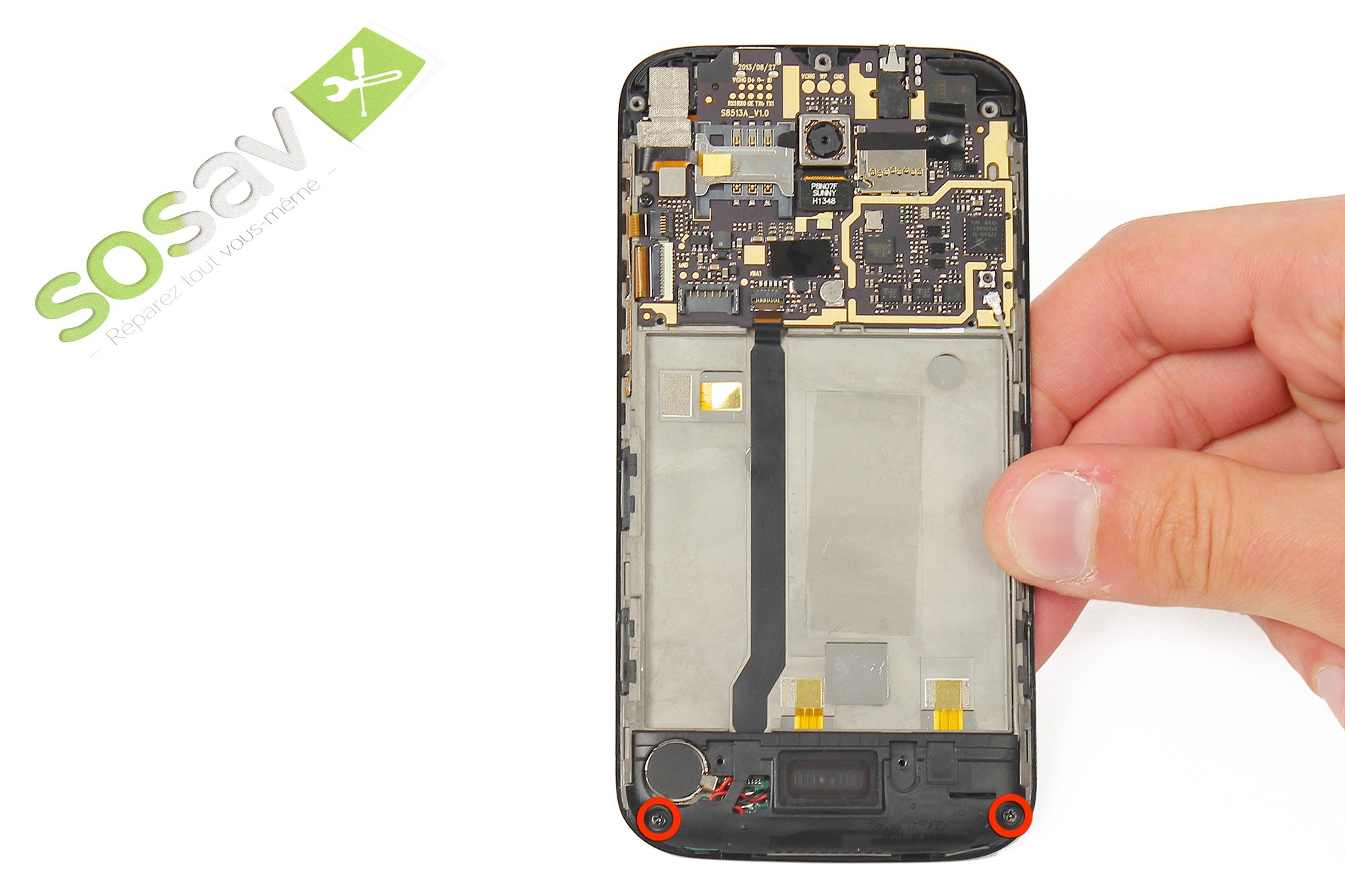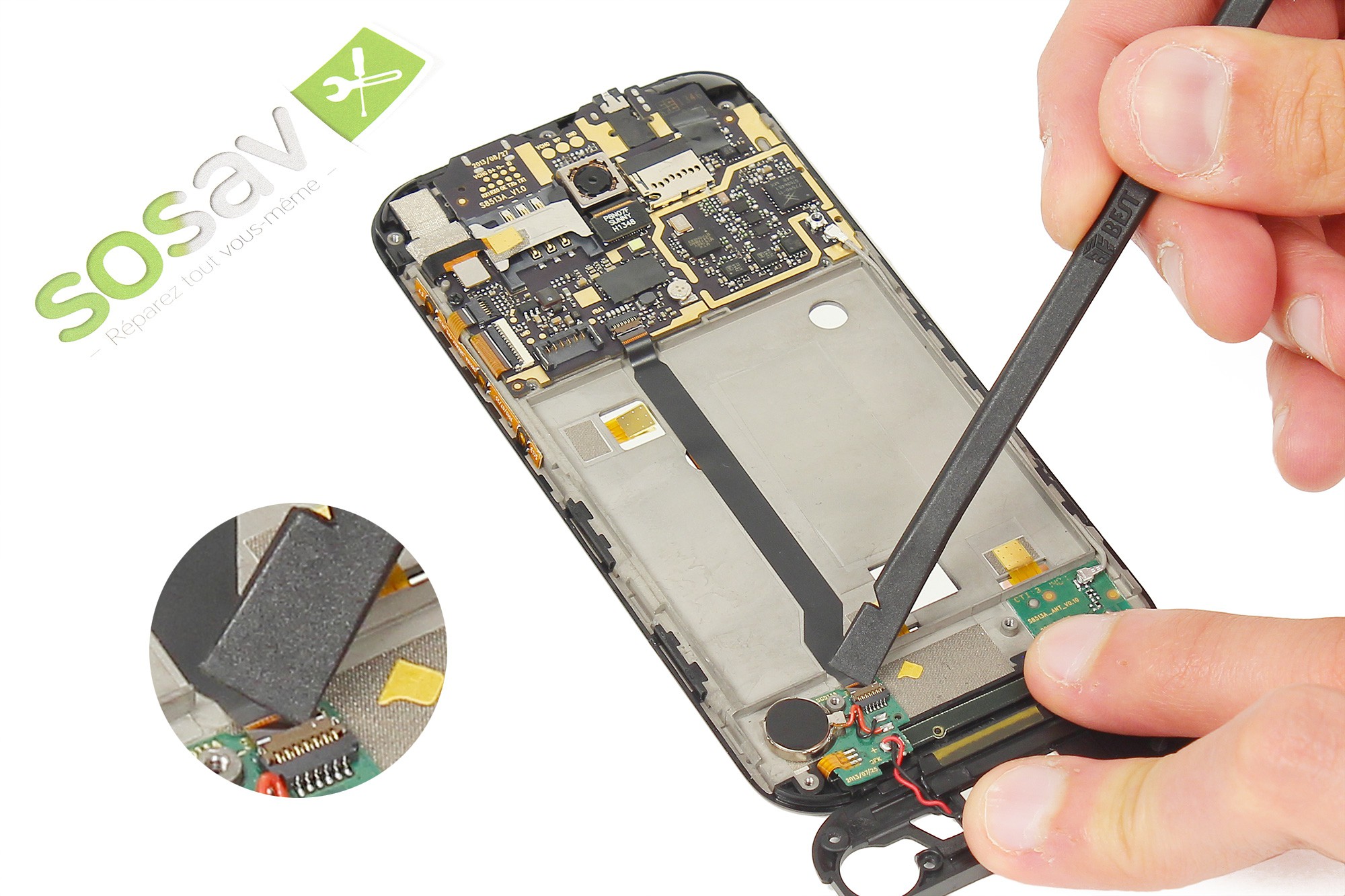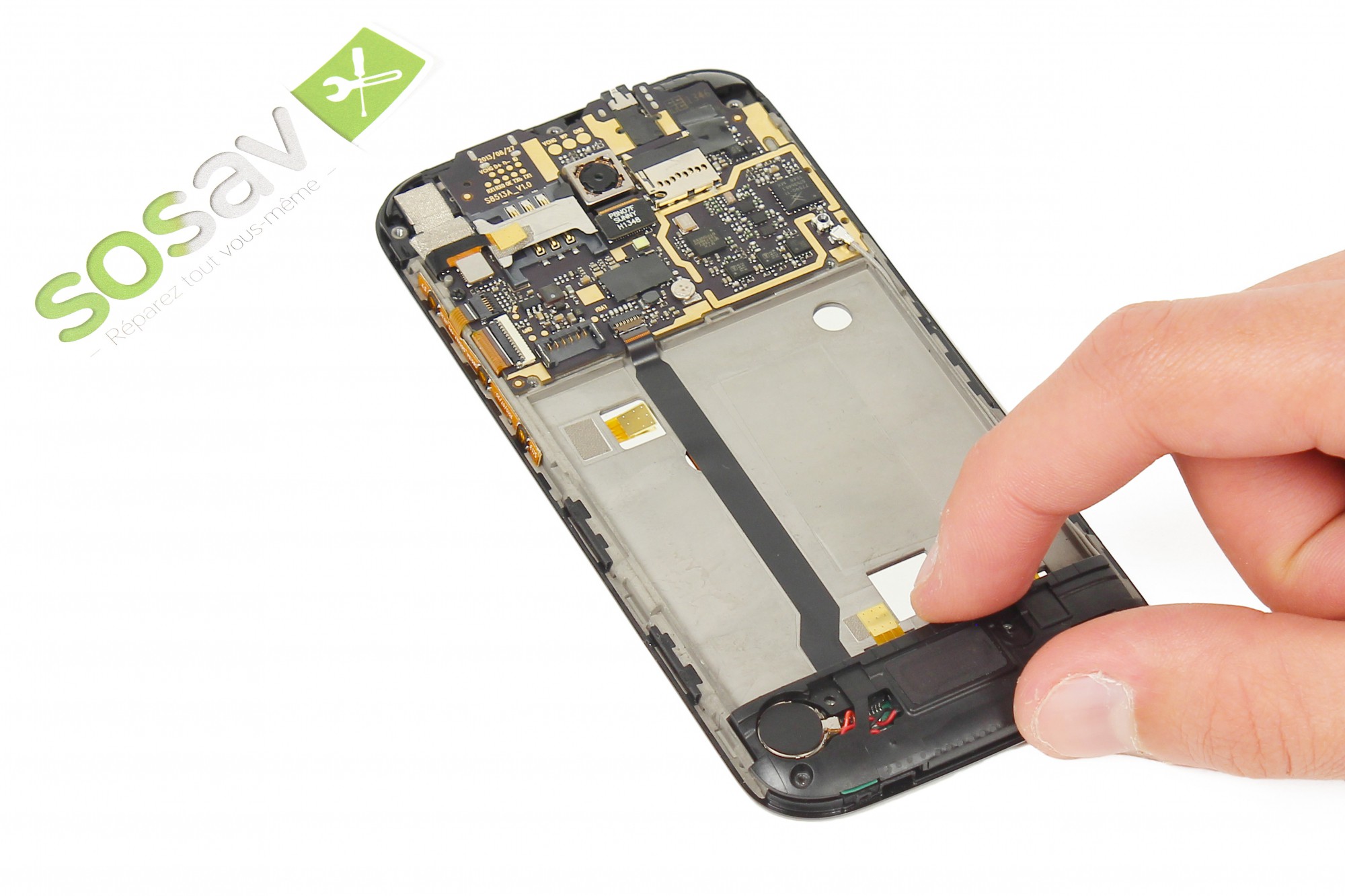 Note : La batterie est collée au châssis du téléphone. Pour ne pas endommager cette dernière, soyez minutieux et ne forcez pas trop.
