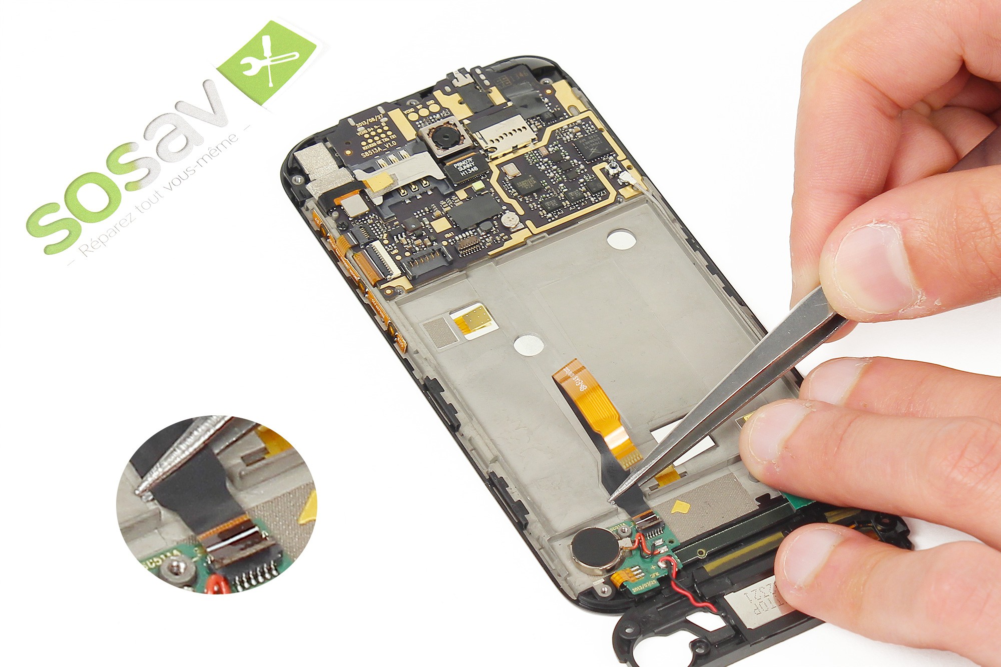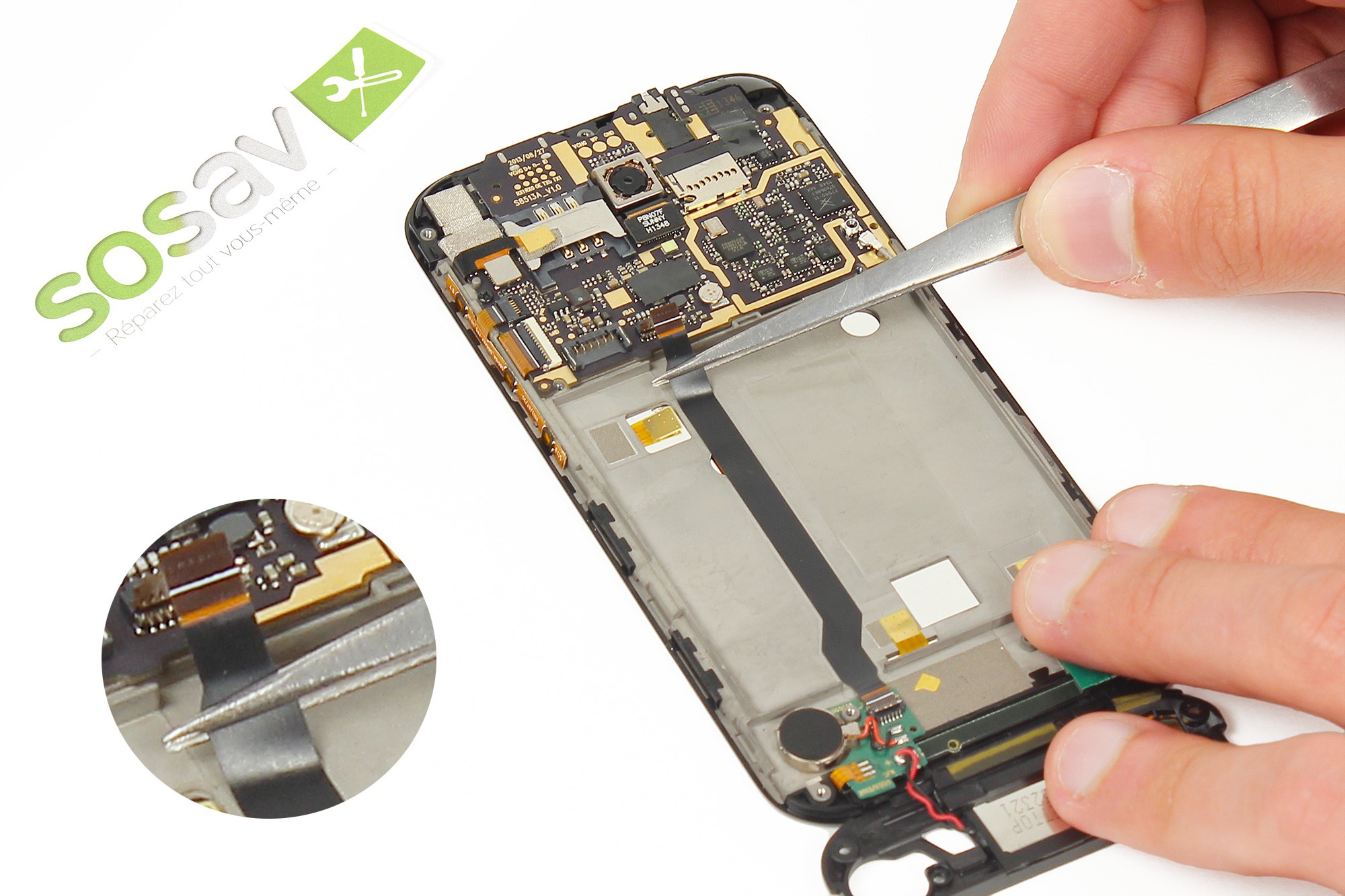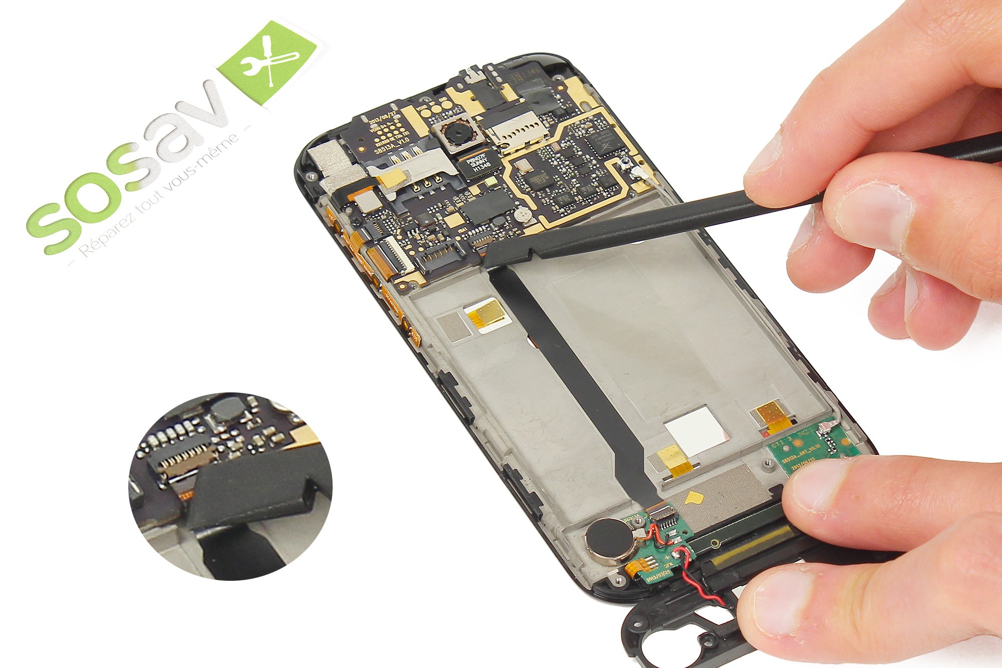 Note : La batterie est collée au châssis du téléphone. Pour ne pas endommager cette dernière, soyez minutieux et ne forcez pas trop.