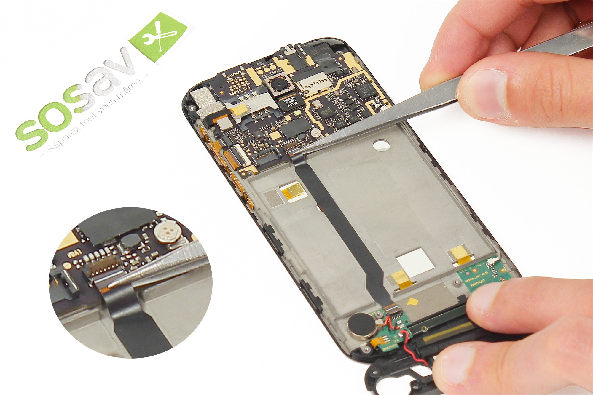 Toujours avec cette pince, retirez et décollez doucement la nappe de liaison de la carte gestion du bas.