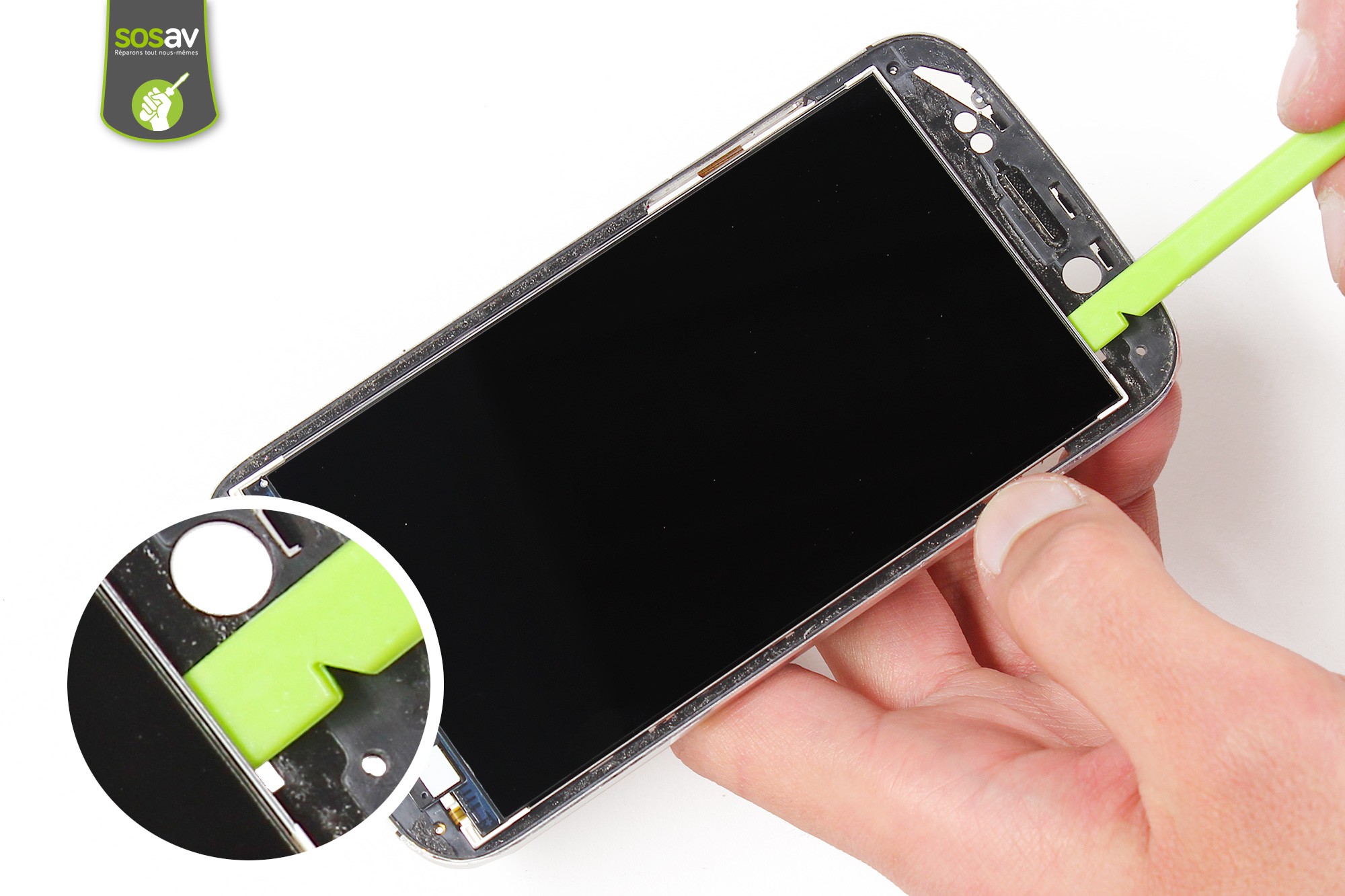 Utilisez ensuite une spatule en nylon afin de déclipser délicatement la coque arrière.Puis retirez la coque.