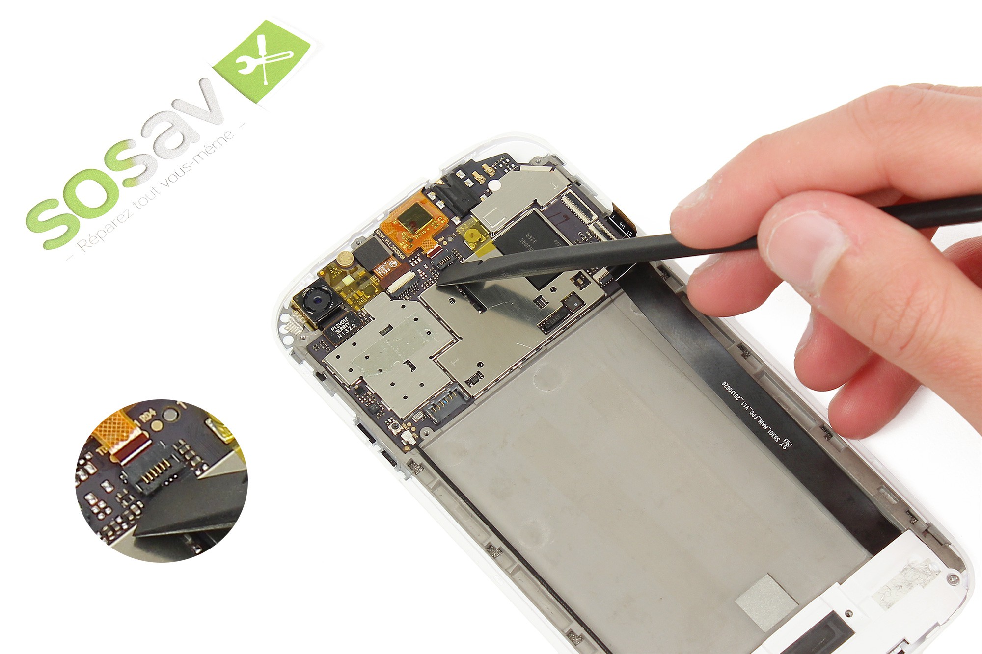 Sortez la nappe du lecteur SIM et microSD de son logement en utilisant la pointe de la spatule.