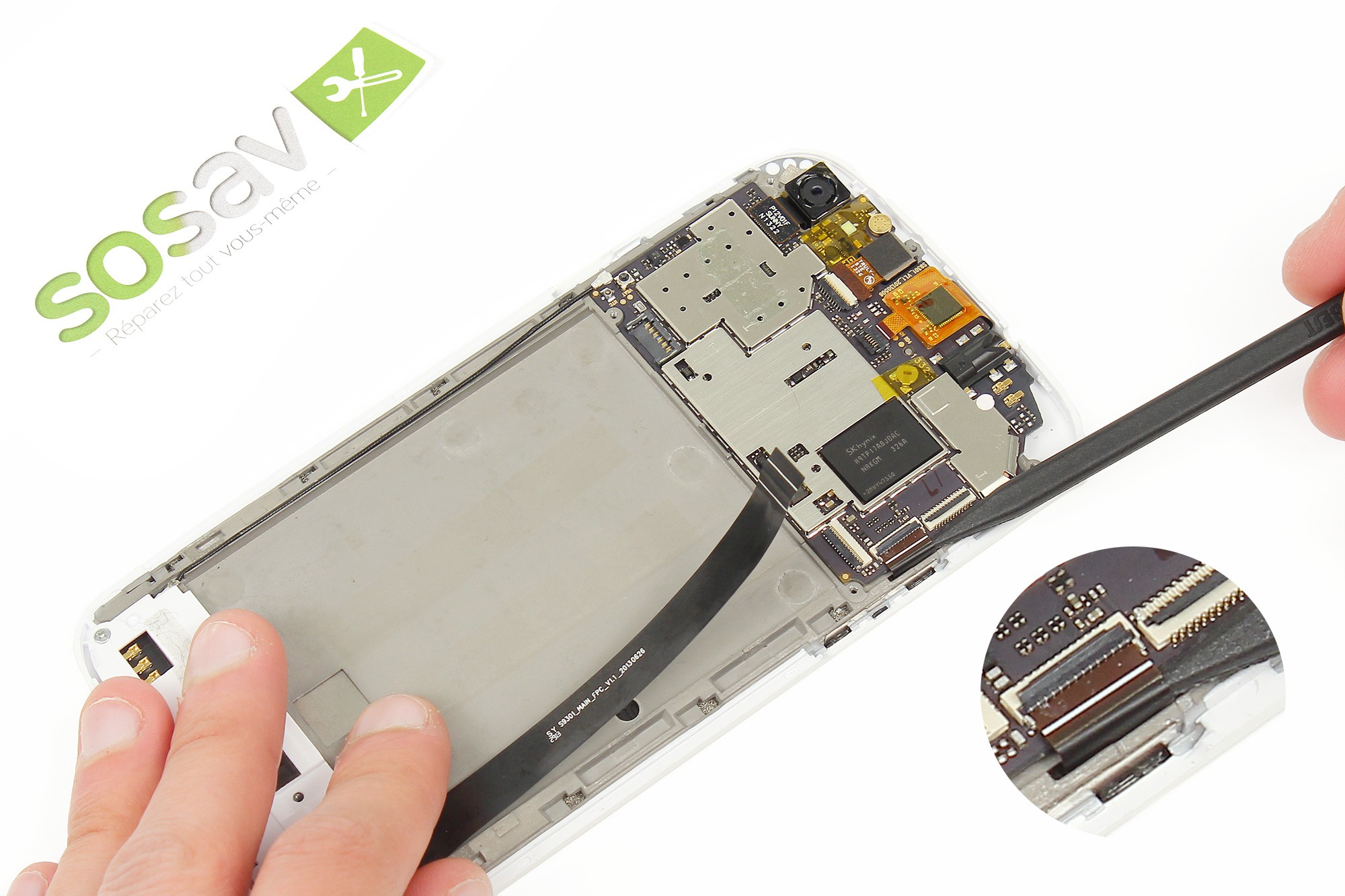Avec la spatule en nylon, déverrouillez le connecteur FPC du lecteur SIM et microSD.