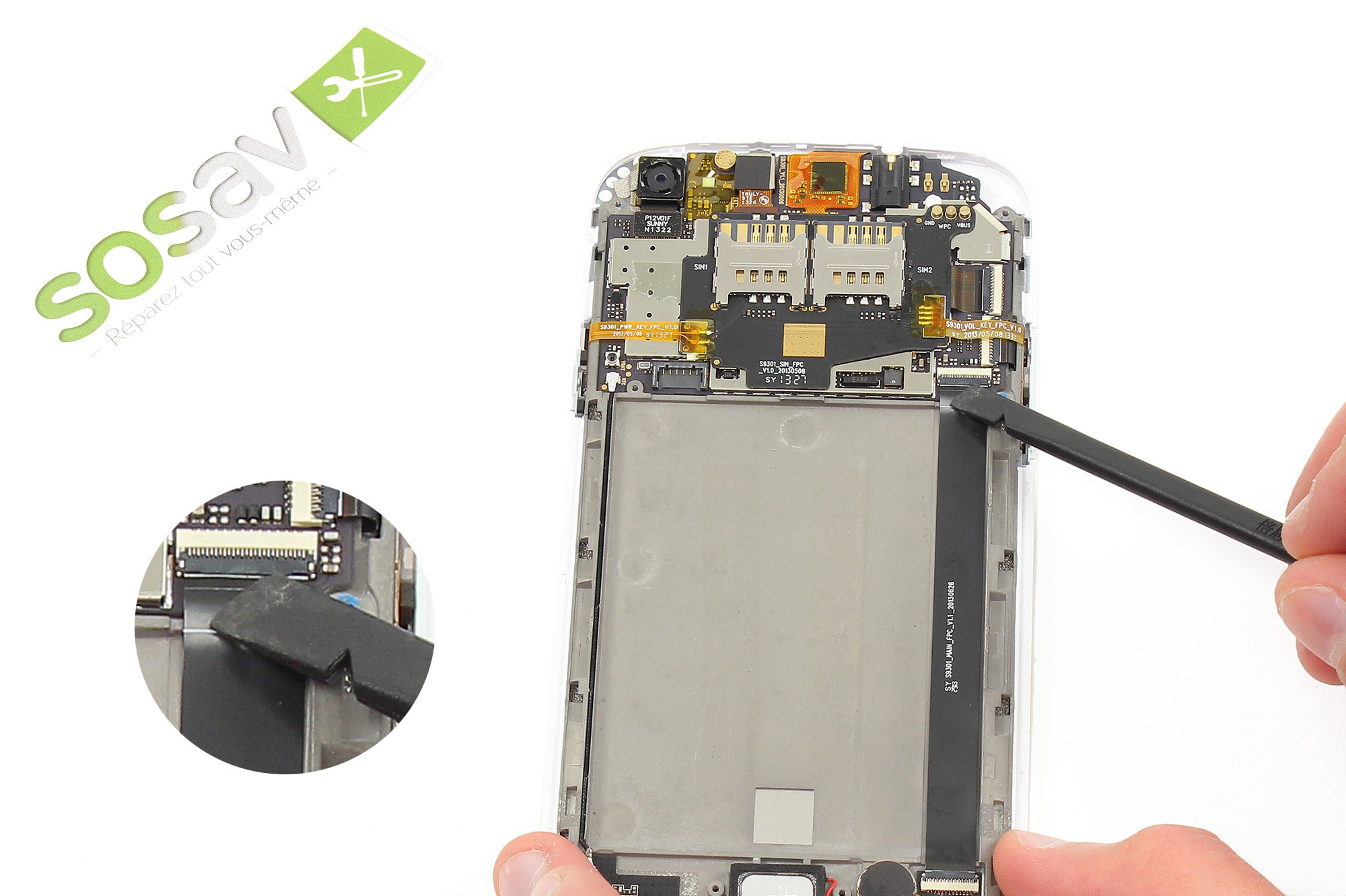Toujours avec la spatule en nylon, déconnectez délicatement le connecteur de la batterie.