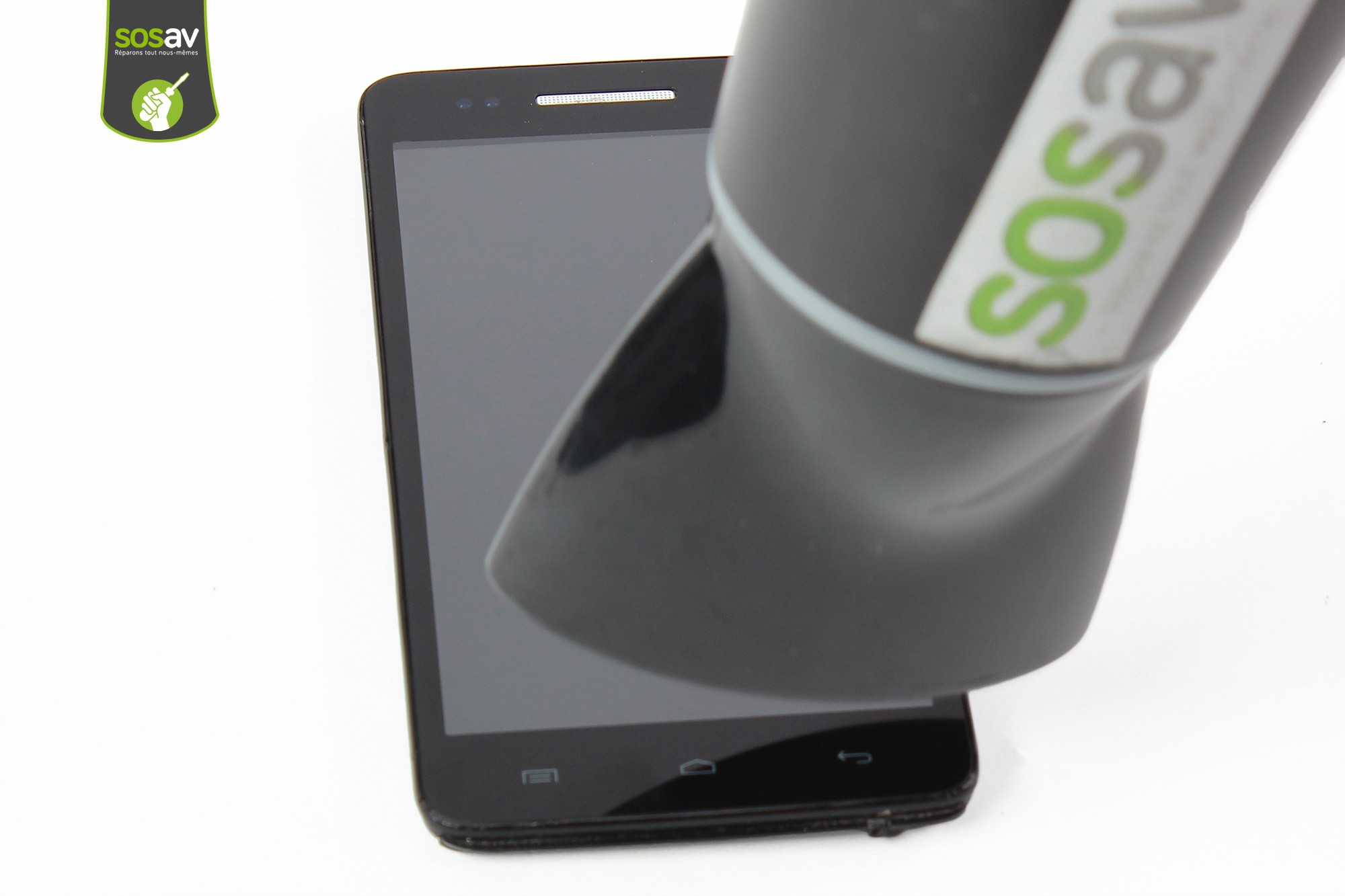 Utilisez un sèche-cheveux afin de réchauffer la partie haute et la partie basse de la vitre tactile (30 secondes maximum par partie).Insérez ensuite délicatement une spatule iSesamo dans la partie basse de la vitre puis faites levier afin de la soulever légèrement.
