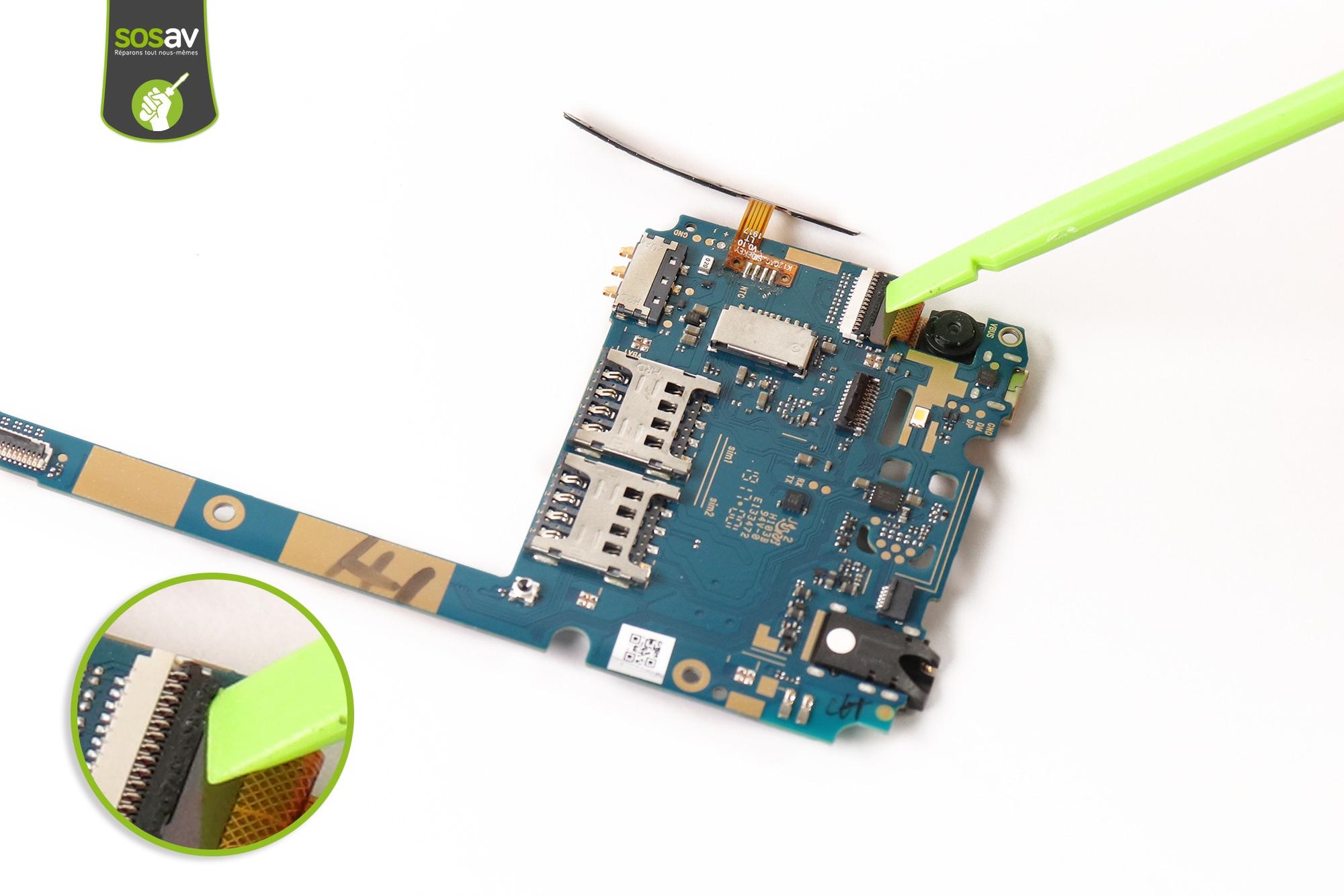 Décollez délicatement la nappe power et volume du châssis à l'aide de la spatule iSesamo.Attention car la nappe est fragile ! Et elle est également rattachée à la carte mère.