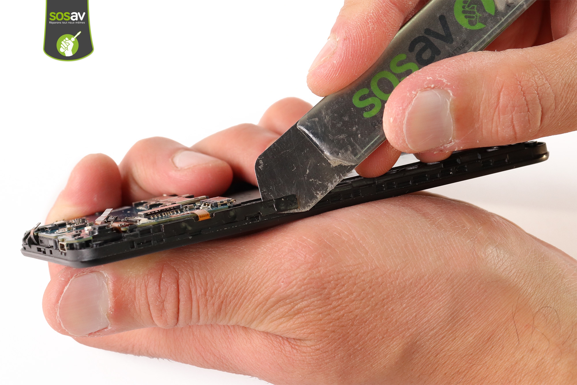 Insérez la spatule en nylon dans l'encoche prévue afin de déclipser et séparer la coque arrière.
