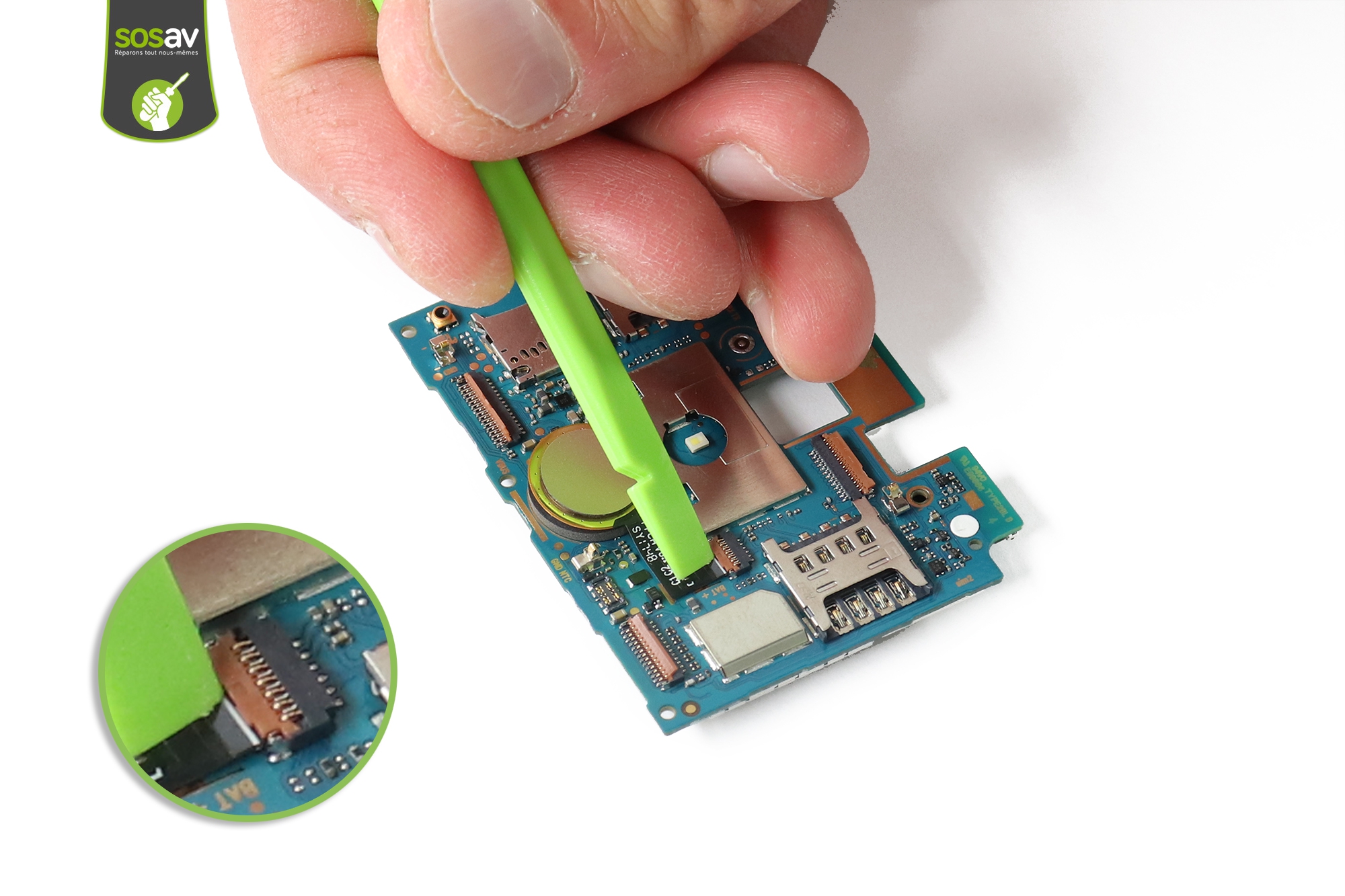 Pour la libérer, débranchez le câble d'interconnexion avec la spatule en nylon.La carte mère est extraite et partiellement démontée.
