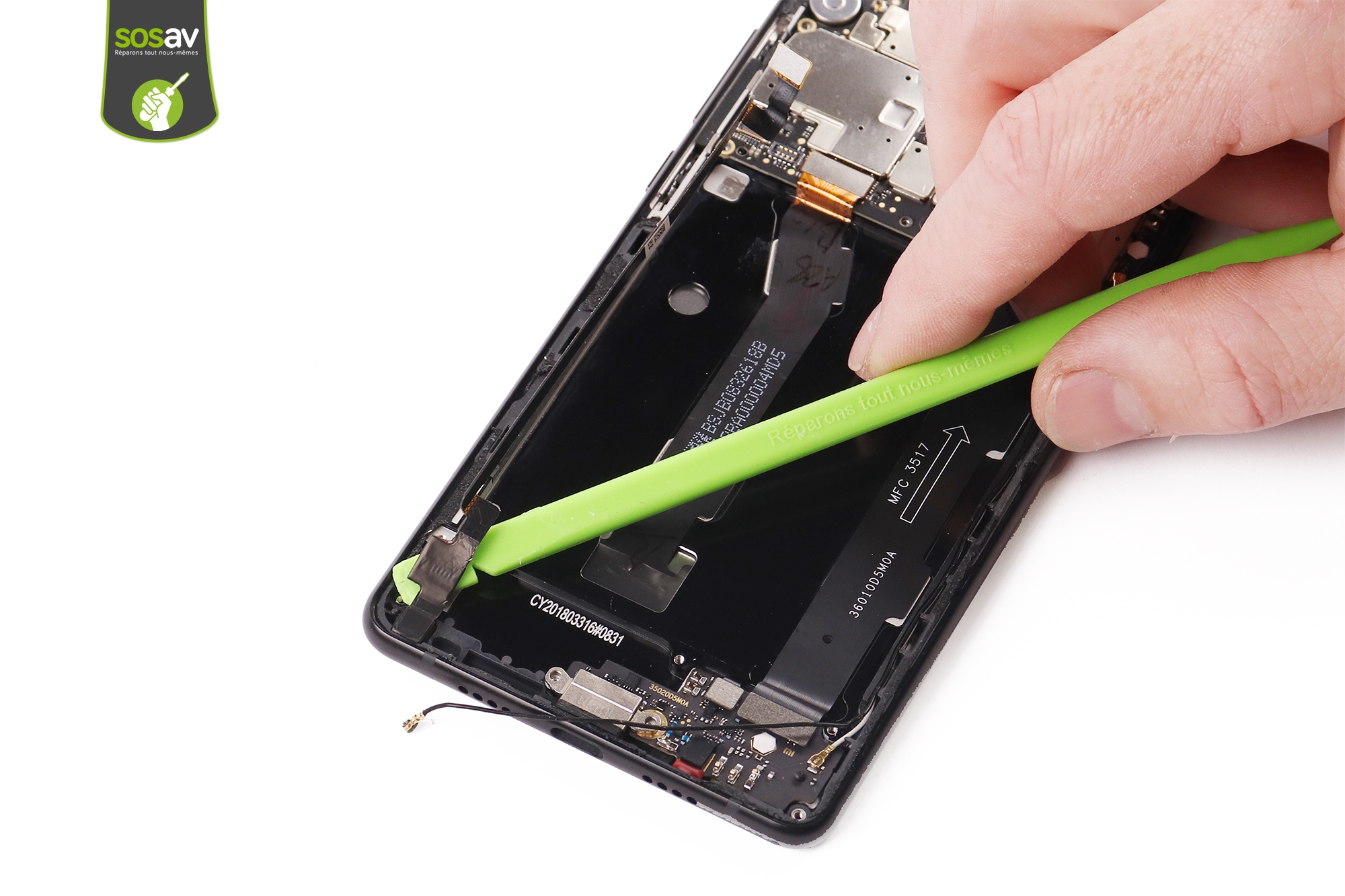 Gardez la spatule en nylon pour décoller et tirer sur les deux stickers qui collent la batterie.Si les stickers cassent, chauffez quelques scondes la face avant opposée à la batterie pour ramollir la colle. Mais ne chauffez jamais directement la batterie.