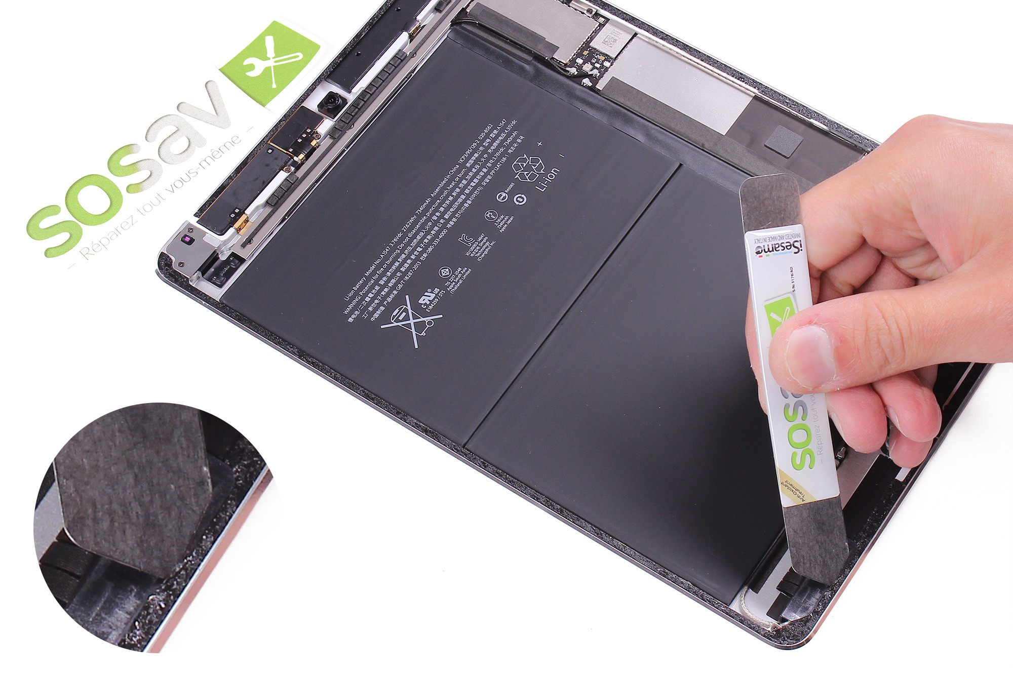 Utilisez la spatule iSesamo afin de décoller délicatement la partie haute et la partie gauche de l'écran de l'iPad.