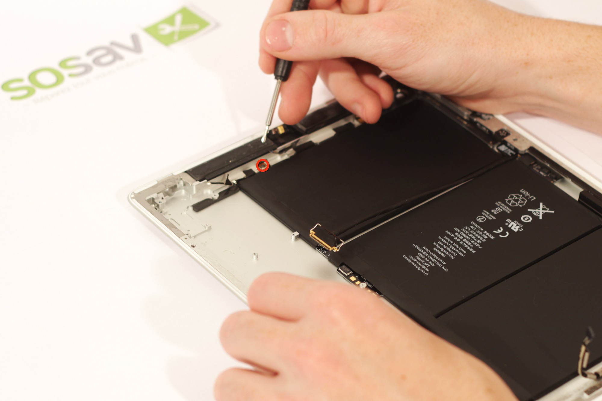 Dévissez désormais la vis cruciforme entouré en rouge la photo.Cette vis permet de retenir le câble de l'antenne GPS à la coque arrière de votre iPad 2.