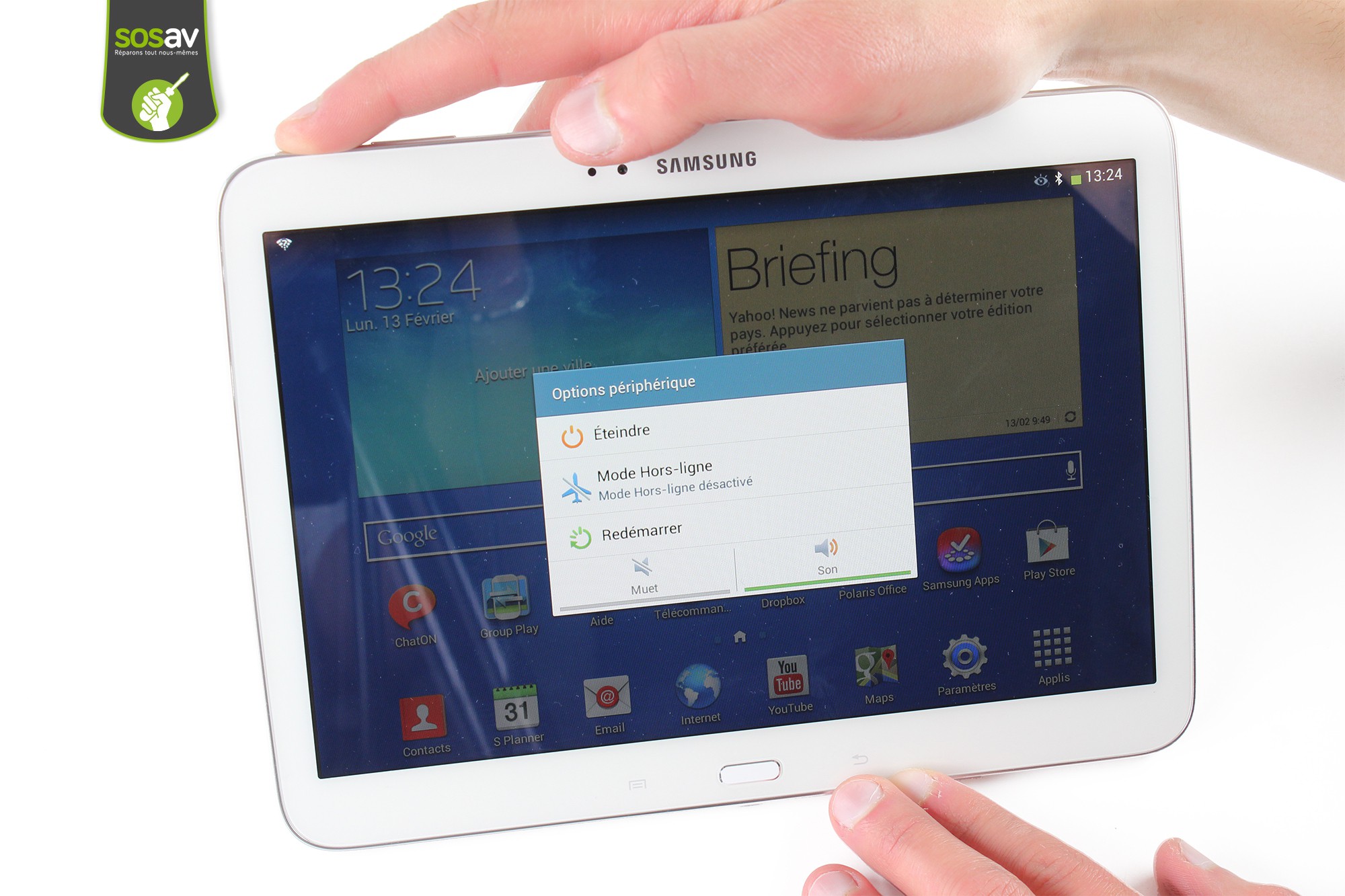 Avant de procéder au changement du haut parleur droit / prise jack / antenne WiFi votre Galaxy Tab 3 10.1, il est nécessaire pour des raisons évidentes de sécurité de l'éteindre.Pour ceci, appuyez sur le bouton d'allumage durant quelques secondes puis confirmez l'extinction par "Éteindre".
